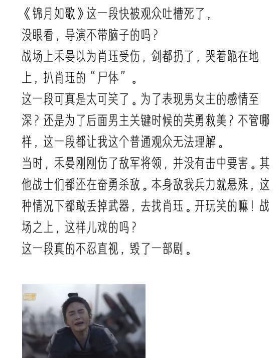 还有之前好歹是一个久经沙场的女将军,感觉一点戒备心都没有,演成了一个爱撒娇卖萌的小姑娘。那段战场找男主的剧情被全网嘲,同袍都在奋力拼杀,她却放下武器跪在地上哭,扒拉要找男主尸体。